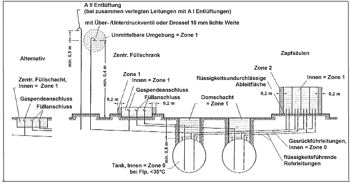 Bild 11: Explosionsgefährdete Bereiche an einer Tankstelle nach Nummer 6.3