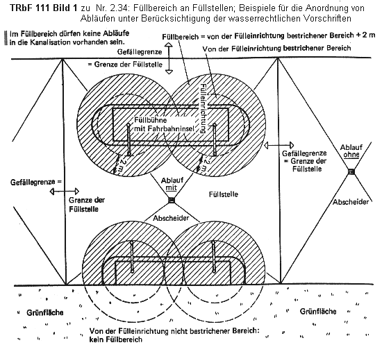 Für die Prüfpflicht von Anlagen mit oberirdischen Behältern nach den wasserrechtlichen Vorschriften ( WHG, VAwS) ist der Gesamtrauminhalt aller in einer Anlage funktionsmäßig zusammengefaßten Behälter maßgebend. 3) Werden sowohl brennbare Flüssigkeiten der Gefahrklasse a I als auch solche der Gefahrklassen a II oder B gelagert, so wird die maßgebliche Gesamtlagermenge nach TRbF 110 Nr. 2.2 Abs. 1 ermittelt. 4) Werden brennbare Flüssigkeiten sowohl in zerbrechlichen Gefäßen als auch in sonstigen Behältern gelagert, so wird die maßgebliche Lagermenge nach TRbF 110 Nr. 2.2 Abs. 3 ermittelt. 5) Von der Prüfpflicht werden auch zugehörige Lagerbehälter und Rohrleitungen erfaßt, soweit diese nicht bereits der Prüfpflicht nach einer anderen "lfd. Nr." unterliegen. Als zugehörig gelten nur Behälter und Rohrleitungen, soweit sie sich bei Füllstellen in Räumen innerhalb dieser Räume und bei Füllstellen im Freien innerhalb der Füllstelle (siehe Bild 1 zu TRbF 111) befinden. 6) Einschließlich der Rohrleitungen zwischen Lagertank und Hydrantenanschluß. 7) Nur Tankstellen mit unterirdischen Tanks oder Rohrleitungen oder mit oberirdischen Tanks mit einem Gesamtrauminhalt über 40.000 Liter. |