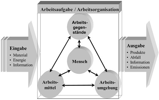 (1) Das Arbeitssystem umfasst das Zusammenwirken eines einzelnen oder mehrerer Benutzer mit den Arbeitsmitteln, um die Funktion des Systems innerhalb der Arbeitsumgebung unter den durch die Arbeitsaufgaben vorgegebenen Bedingungen zu erfüllen (siehe auch Literaturverzeichnis: DIN EN ISO 46385 Grundsätze der Ergonomie für die Gestaltung von Arbeitssystemen (Ausgabedatum: 2004-05)).