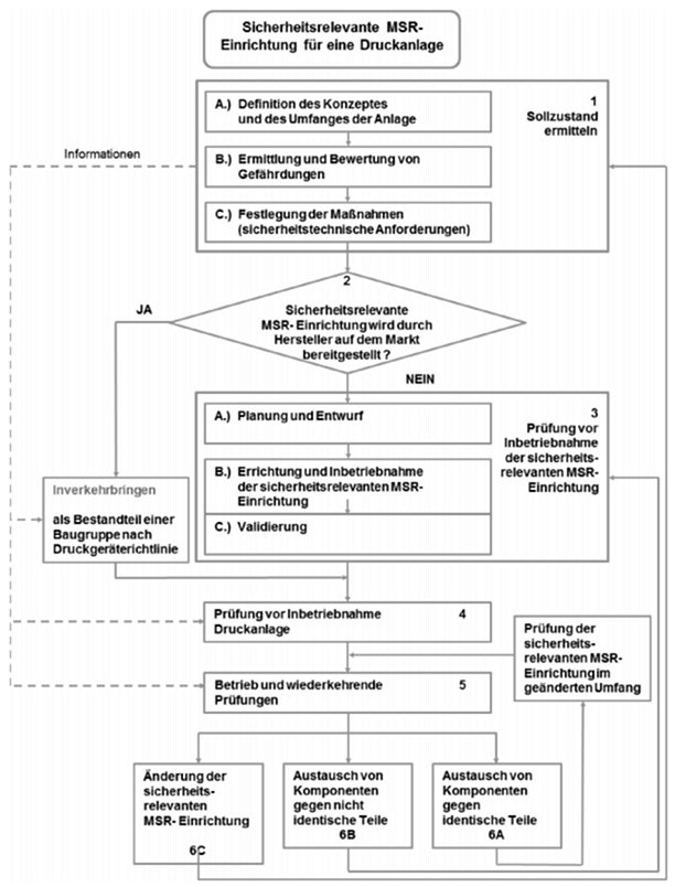 (1) Der Sollzustand für die sicherheitsrelevanten MSR-Einrichtungen wird im Rahmen der Gefährdungsbeurteilung ermittelt. Die Prozessschritte A.) bis C.) gehören in den Umfang der Gefährdungsbeurteilung der Druckanlage nach TRBS 1111.