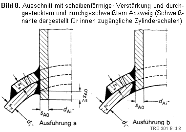 | (4) | durch scheibenförmige Verstärkungen, Bilder 7 und 8. Diese Ausführungsorten dürfen nur für Berechnungstemperaturen< 250 °C verwendet werden; die Anlage 1 dieser TRD gilt nicht für diese Ausführung. Scheibenförmige Verstärkungen müssen gut an den Grundkörper angepaßt sein. Ihre tragende Breite, Bilder 7 und 8, darf höchstens mitbs =eG nach Gl. (10) eingesetzt werden. Die DickesS solcher Verstärkungen darf nicht größer in die Rechnung eingesetzt werden, als die ausgeführte Wanddicke se des Grundkörpers ist. Gegen Biegemomente, die an einem am Ausschnitt angesetzten Abzweig angreifen, sind solche Verstärkungen wenig wirksam. |
