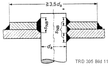 3.2.5 Bei eingeschweißten Längsankern, Ankerrohren oder Stehbolzen soll der Abscherquerschnitt der Kehlnaht mindestens das 1,25fache des erforderlichen Bolzen- oder Ankerrohr-Querschnittes betragen, z.B. in den Bildern 11 bis 13 da × π × sNB> 1,25 Aσ