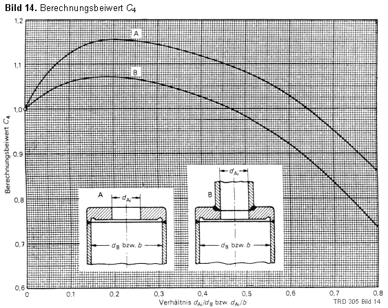 wobei s bei Böden mit Ausschnitten die Dicke eines Vollbodens ohne Ausschnitte bedeutet. Des weiteren muß die Wanddicke s2 nach Bild 1a größer oder gleich der erforderlichen Wanddicke s0 des angeschlossenen Mantels sein.