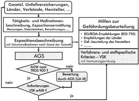 (1) Die Aufnahme von VSK in die TRGS 420 erfolgt auf Beschluss des AGS nach dem Schema von Bild 1. Voraussetzung ist das Vorliegen von Expositionsbeschreibungen gemäß den Anforderungen dieser TRGS einschließlich Festlegung der zu den VSK gehörenden Schutzmaßnahmen und ihrer Wirksamkeitsprüfung.