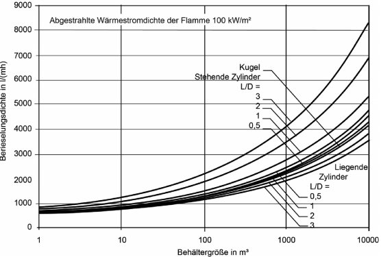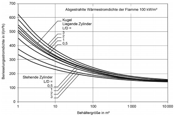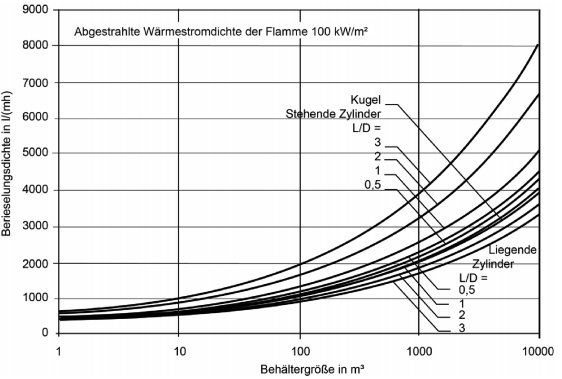 Die erforderlichen Berieselungs-/Beflutungsstromdichten sind in Abhängigkeit vom Behältervolumen für Kugelbehälter und stehende bzw. liegende zylindrische Behälter in den Abbildungen 8a und 8b dargestellt; die dazugehörigen Berieselungs-/Beflutungsdichten ergeben sich aus den Abbildungen 9a und 9b.