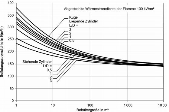 (9) Die Bemessung des Sicherheitsventils muss für den Wärmeeintrag bei der ermittelten zulässigen Werkstofftemperatur so erfolgen, dass ein Druckanstieg über den Auslegungsdruck des ortsfesten Druckgasbehälters hinaus nicht möglich ist. Basis für die genannten Bemessungen sind Brandlastversuche an Flüssiggaslagerbehältern.