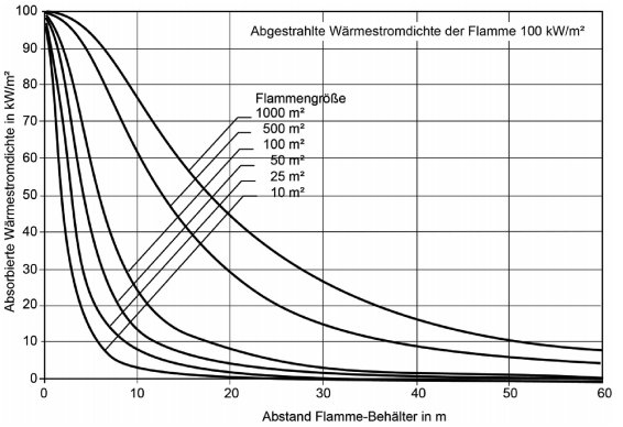 Die auf der Behälteroberfläche auftreffende Wärmestromdichte ist in Abbildung 10 über der Entfernung aufgetragen; man erkennt beispielsweise bei einer Flammengröße von 10 m2, dass sich q´abs von 100 kW/m2 (Abstand 0) schon in einer Entfernung von 5 m auf 11 kW/m2 verringert.
