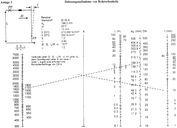 Das Nomogramm gilt auch für Flanschverbindungen im Rohrschenkel, wenn Fz = FRP (n. DIN 2505) und die Wanddicke des Rohres entsprechend FR ausgelegt ist.