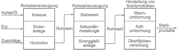Stahl wird auf der Verfahrensroute Hochofen-Konverter in integrierten Hüttenwerken erzeugt, die überwiegend über eigene Kokereien verfügen oder im Verbund mit Kokereien betrieben werden. Hüttenwerke sind in die Erzeugungsstufen Roheisenerzeugung, Rohstahlerzeugung und Fertigung von Stahlprodukten gegliedert (Abbildung 1). Die Oberflächenveredlung ist auf Werke mit entsprechender Flachstahl- bzw. Drahterzeugung beschränkt.