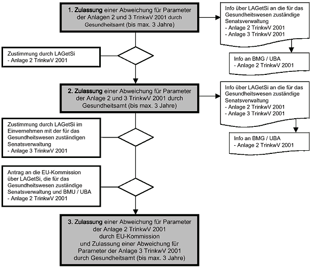 | Melde- und Übermittlungsflüsse bei der Zulassung einer Abweichung vom Grenzwert der TrinkwV 2001 für Anlagen nach Nummer 2 Buchstabe c, d sowie e, sofern Wasser an die Öffentlichkeit abgegeben wird |