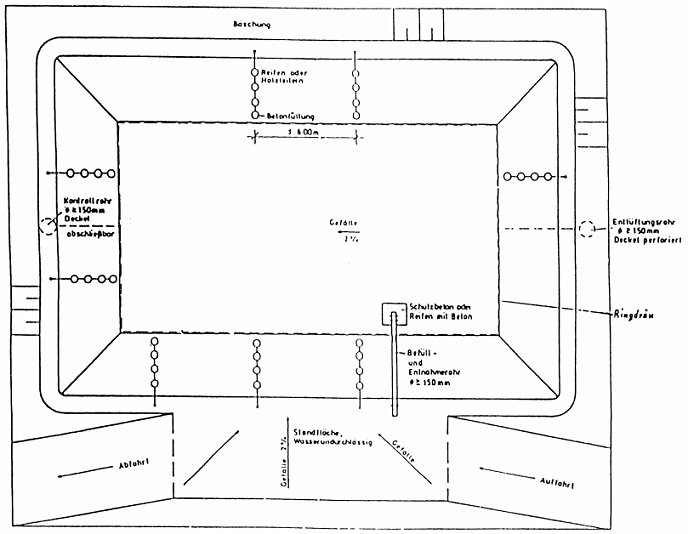 In wasserwirtschaftlich bedeutsamen Gebieten ist aus Vorsorgegründen als Leckerkennungsmaßnahme eine Ringdränage zur Kontrolle der Lagerbehälter auf Undichtheiten während des Betriebes erforderlich (siehe Anlage 1).