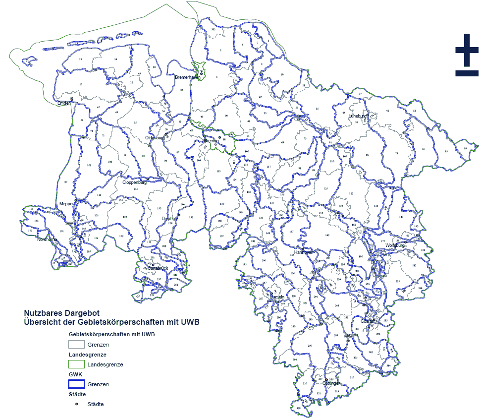 Ein Grundwasserkörper ist gemäß § 3 Nr. 4 der Niedersächsischen Verordnung zum wasserrechtlichen Ordnungsrahmen vom 27.07.2004 (Nds. GVBl. S. 268) ein abgegrenztes Grundwasservolumen innerhalb eines Grundwasserleiters oder mehrerer Grundwasserleiter. Aus der Verschneidung der Grenzen der Grundwasserkörper mit den Gebietsgrenzen der zuständigen unteren Wasserbehörden ergeben sich Teilkörper innerhalb des jeweiligen Grundwasserkörpers. Die oberirdischen Grenzen der Körper sind der anliegenden Karte (Anlage 1) zu entnehmen.
