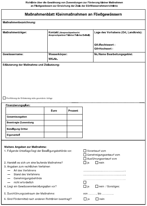 6.4 Dem Antrag auf Zuwendung muss eine Erläuterung des Vorhabens auf dem in der Anlage enthaltenen Vordruck beigefügt sein. Hierin sind Angaben über den Zustand der Umwelt bei Antragstellung und eine Abschätzung der durch die vorgesehenen Maßnahmen zu erwartenden Auswirkungen auf die wasserwirtschaftlichen, naturschutzfachlichen, landwirtschaftlichen und ggf. sonstigen Belange zu machen.