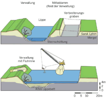Der technische Ausbau hat vielfach durch die tiefen Sohllagen zu einer Entkopplung der Gewässer von ihrer Aue geführt. Die Aue wird hierdurch seltener überflutet, die gewässernahen Grundwasserstände abgesenkt und so die Entwicklung auentypischer Strukturen und Lebensgemeinschaften gestört. Dem kann durch ein Anheben der Sohle entgegengewirkt werden. Wesentliche Voraussetzung hierfür ist auch die Möglichkeit, das Gewässerbett auf eine gewässertypspezifische Breite aufzuweiten, um die Tiefenerosion zu stoppen.